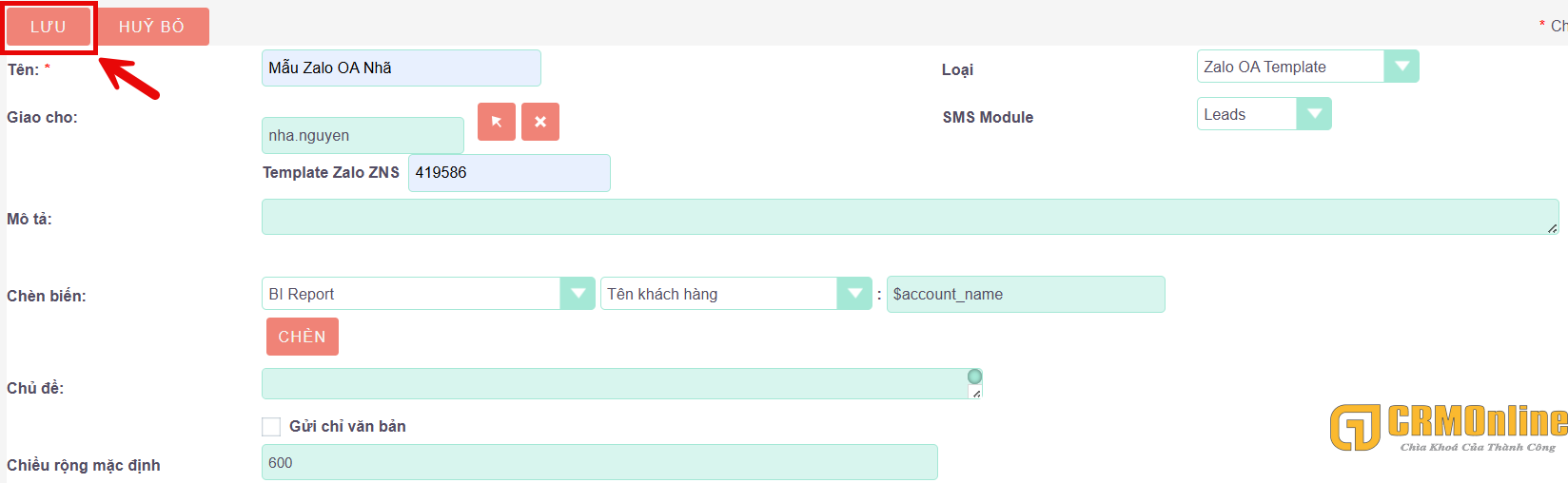 * **Template Zalo ZNS**: Nhập mã template Zalo ZNS.