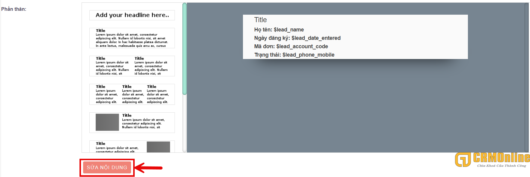 ![](https://3971044875-files.gitbook.io/~/files/v0/b/gitbook-legacy-files/o/assets%2F-MVPPvtkVmjRvNZvoU53%2F-MVeptXDFWupNrXjbtwa%2F-MVesaEX02eGdS7h2Az9%2Ffinger_32.png?alt=media\&token=14267807-527d-4b7d-ab1e-e1c0b418812a) Mục đích để có thể lấy dữ liệu động từ CRM gửi đi khi cần thiết.