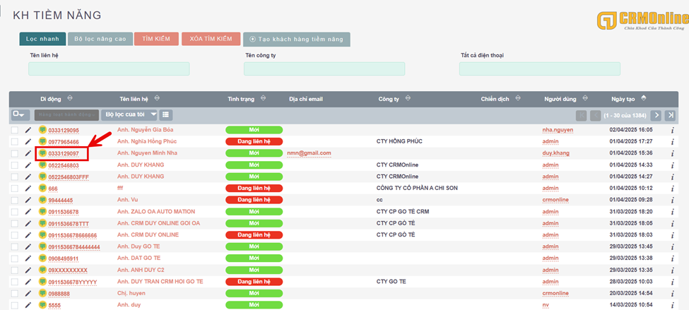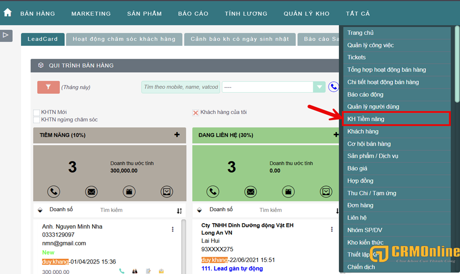 1. Chọn **KH Tiềm năng** để xem danh sách khách hàng.